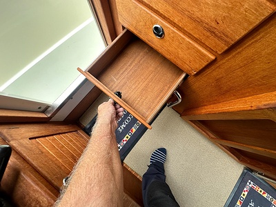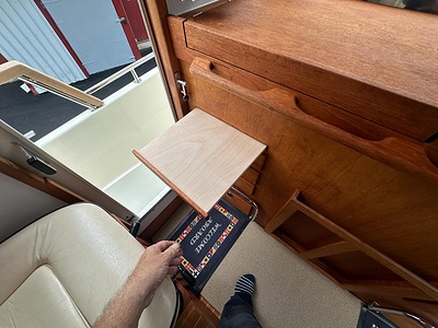 Bord i salongen samt bord till fören med separat fack för att stuva undan