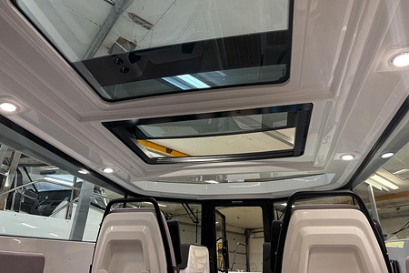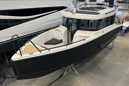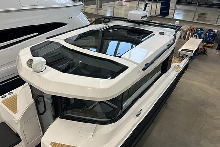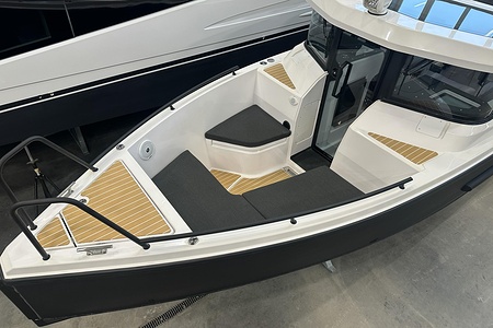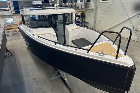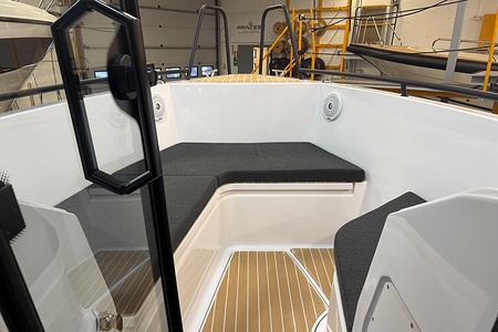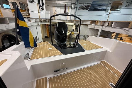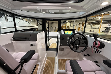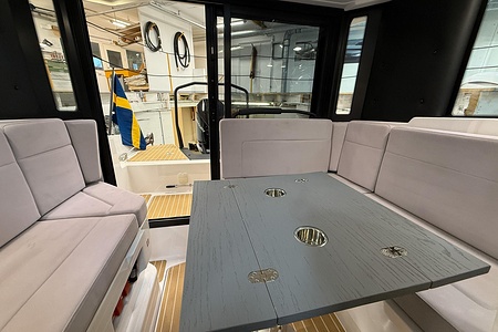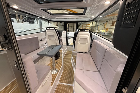 Planlösningen är smart och väl genomtänkt med en ljus och skyddad kabin, bekväma sittplatser samt praktiska lösningar som gör båten perfekt för såväl dagsturer som weekendutflykter. Här sitter man tryggt och bekvämt i alla väder, med en layout som verkligen maximerar utrymmet ombord.