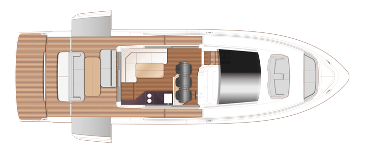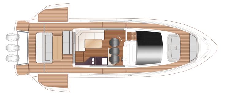 Her enclosed saloon brings together lounge and galley areas with panoramic windows and an optional sliding roof, allowing owners to enjoy an open-air feeling or complete shelter at the touch of a button. Triple sliding patio doors connect the saloon seamlessly to the cockpit, where a spacious dining area and wetbar encourage social gatherings. Twin side doors at the helm provide direct deck access, enhancing practicality on board. For inboard engine variants, an optional up/down hydraulic bathing platform makes water access effortless.