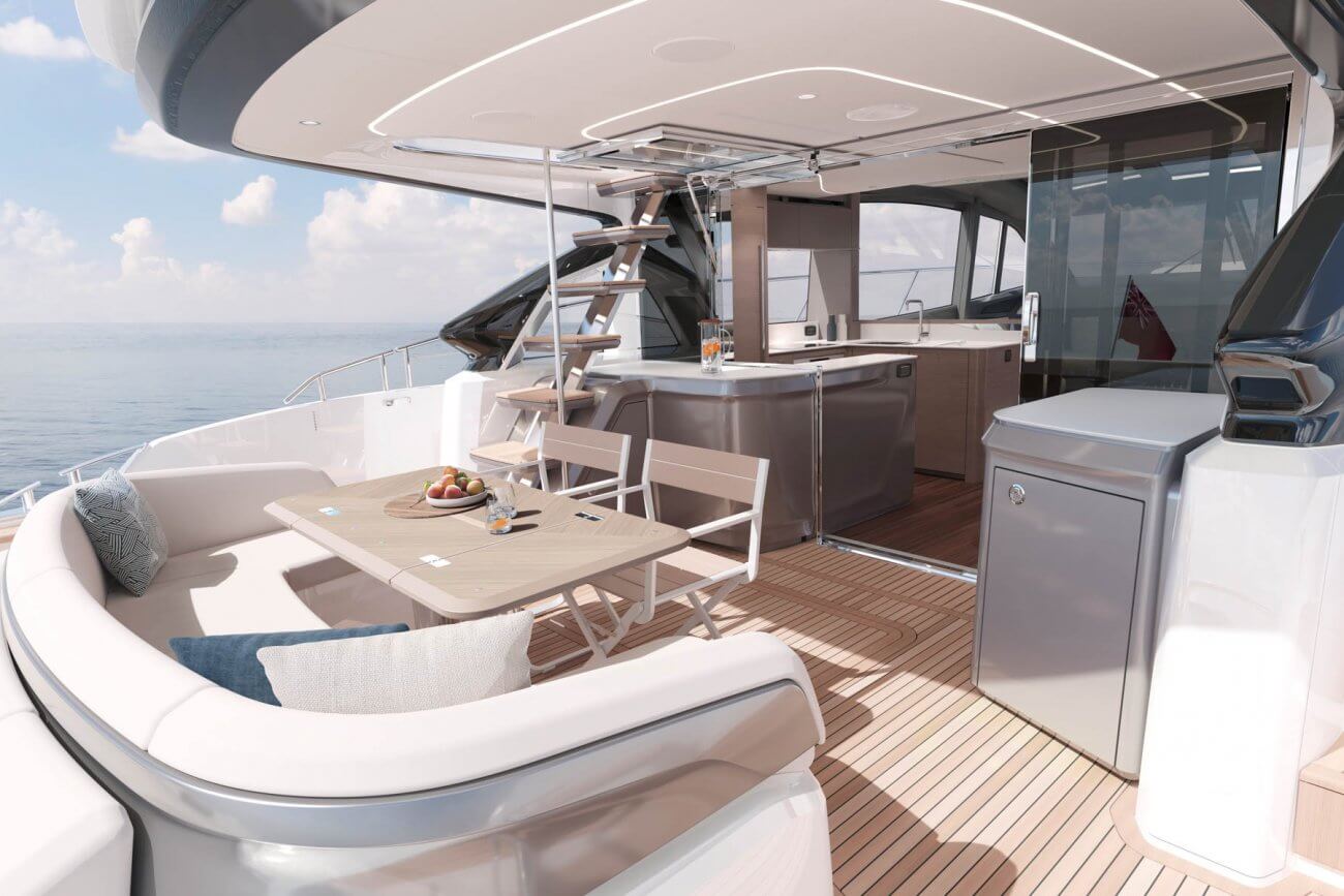 Huvuddäcket flyter sömlöst från utsidan till insidan, med stora fönster längs skrovet, skjutdörrar akterut, ett elektriskt skjutbart tak och en sittgrupp som förbinder wetbaren med den inre köket.
