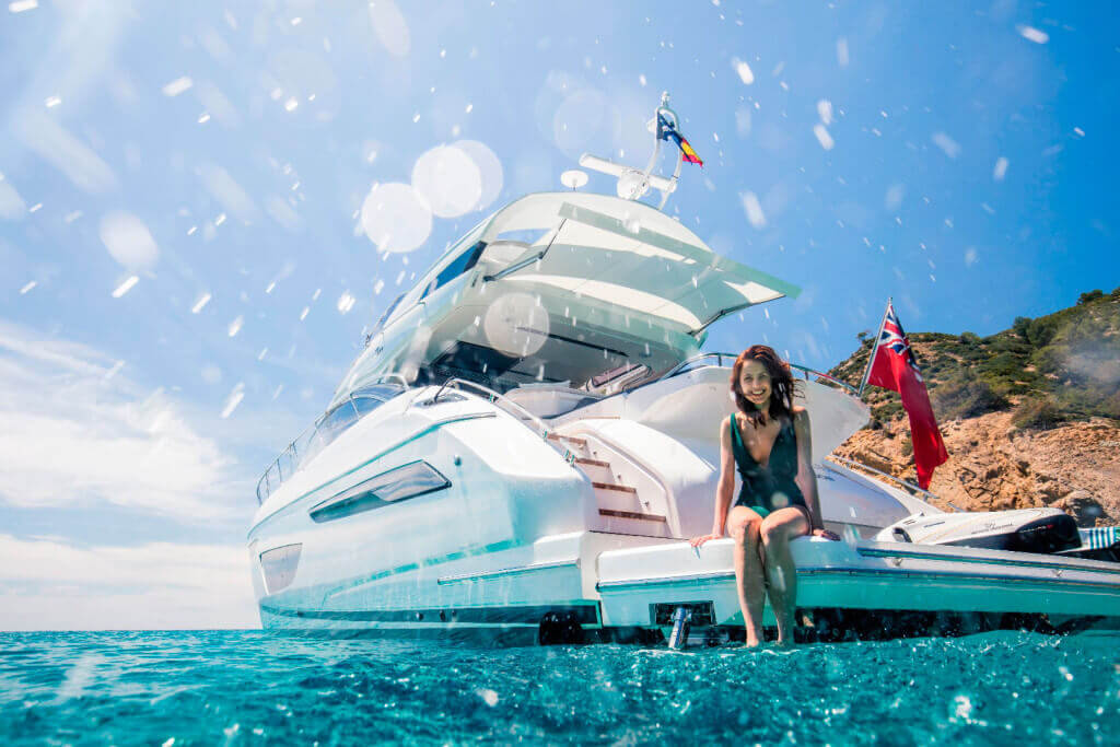 • Twin transom gates leading to bathing platform with electro-hydraulic raise/lower mechanism, foldaway swimming ladder and hot and cold shower