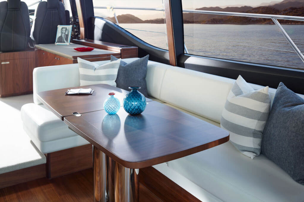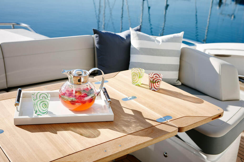 • Teak-laid transom platform, cockpit deck, sportbridge, sportbridge stairs, side decks and stairs to side decks