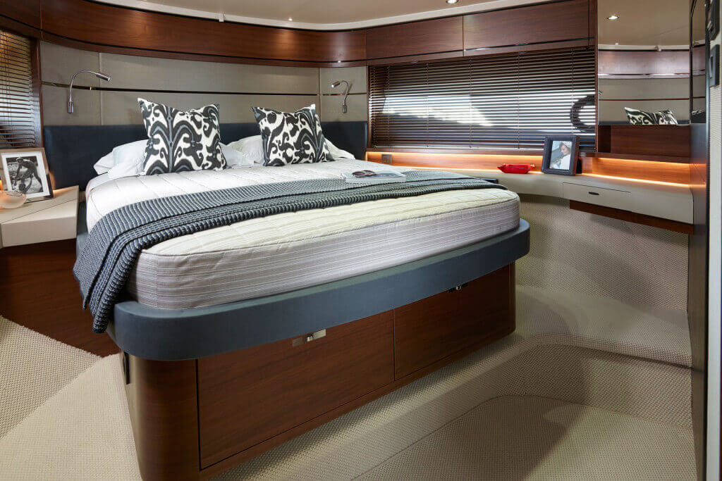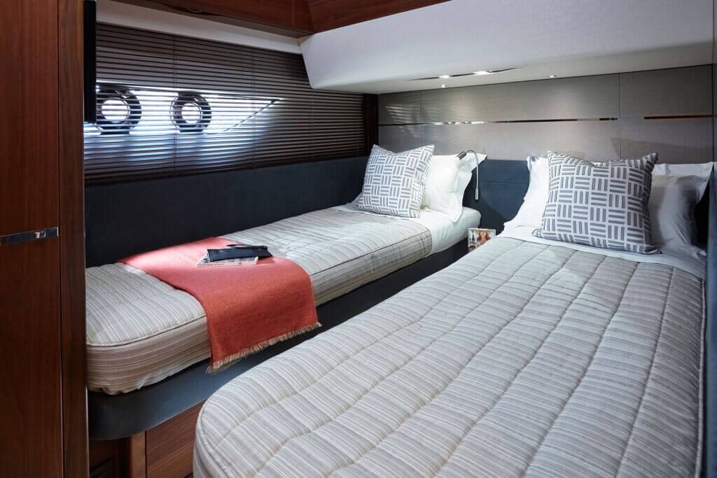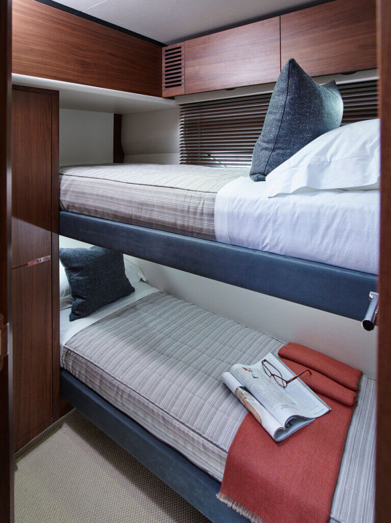 • Two single berths with drawers below with optional powered sliding conversion to double