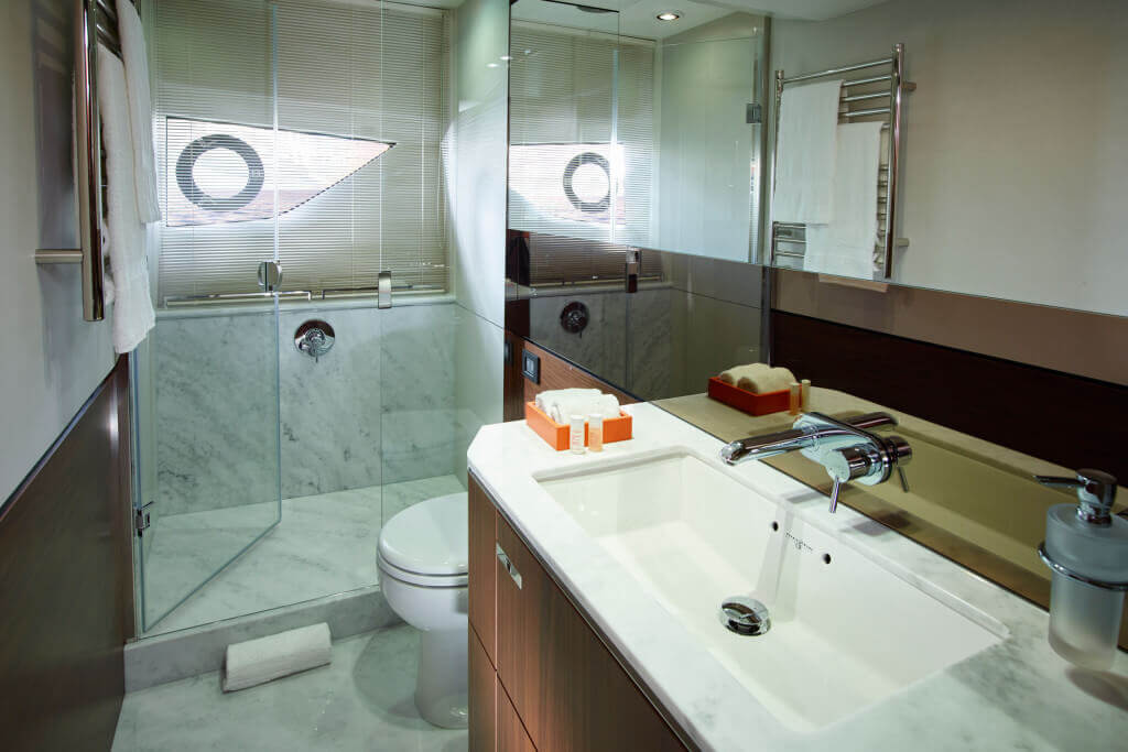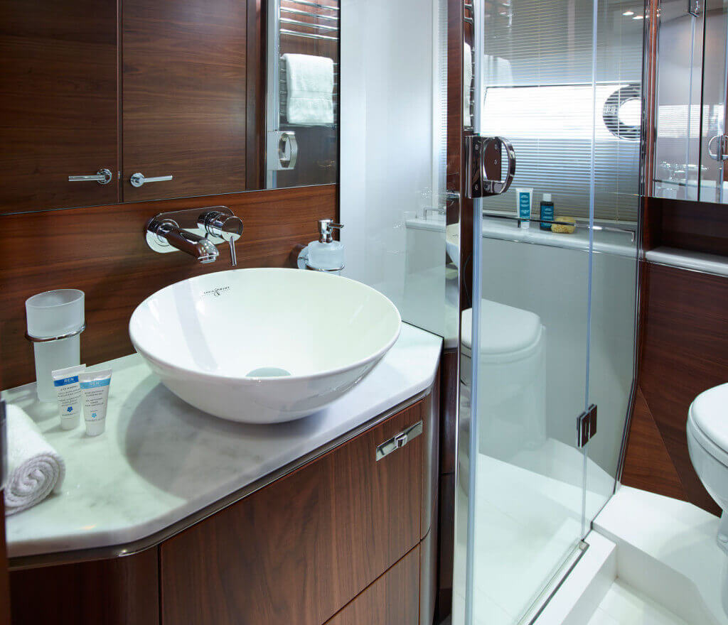 • Bathroom with stall shower, electric freshwater toilet and washbasin