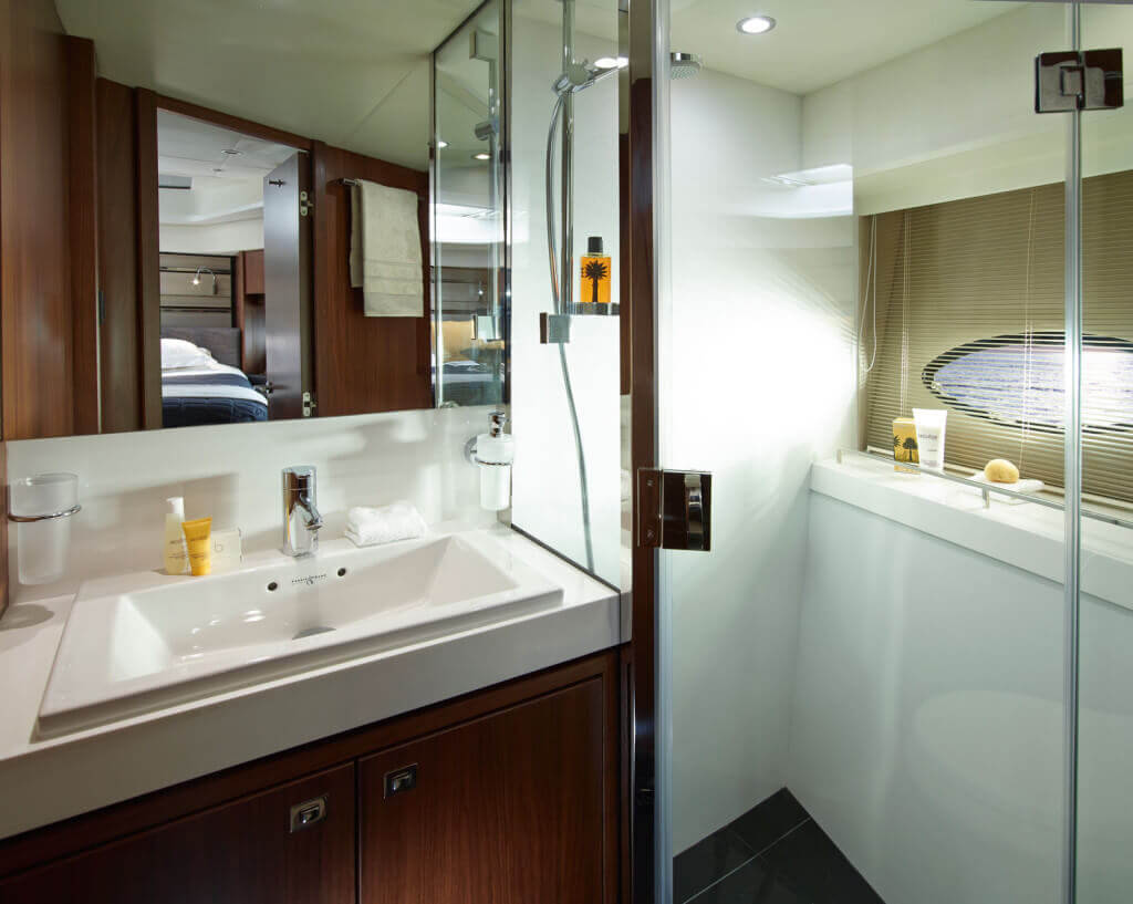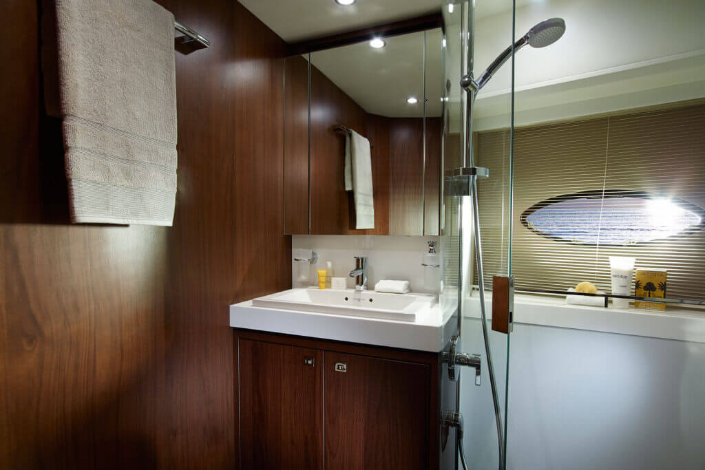 • Bathroom with stall shower, electric freshwater toilet and washbasin