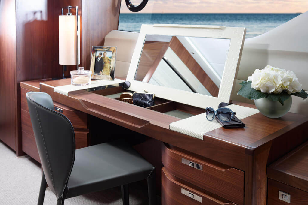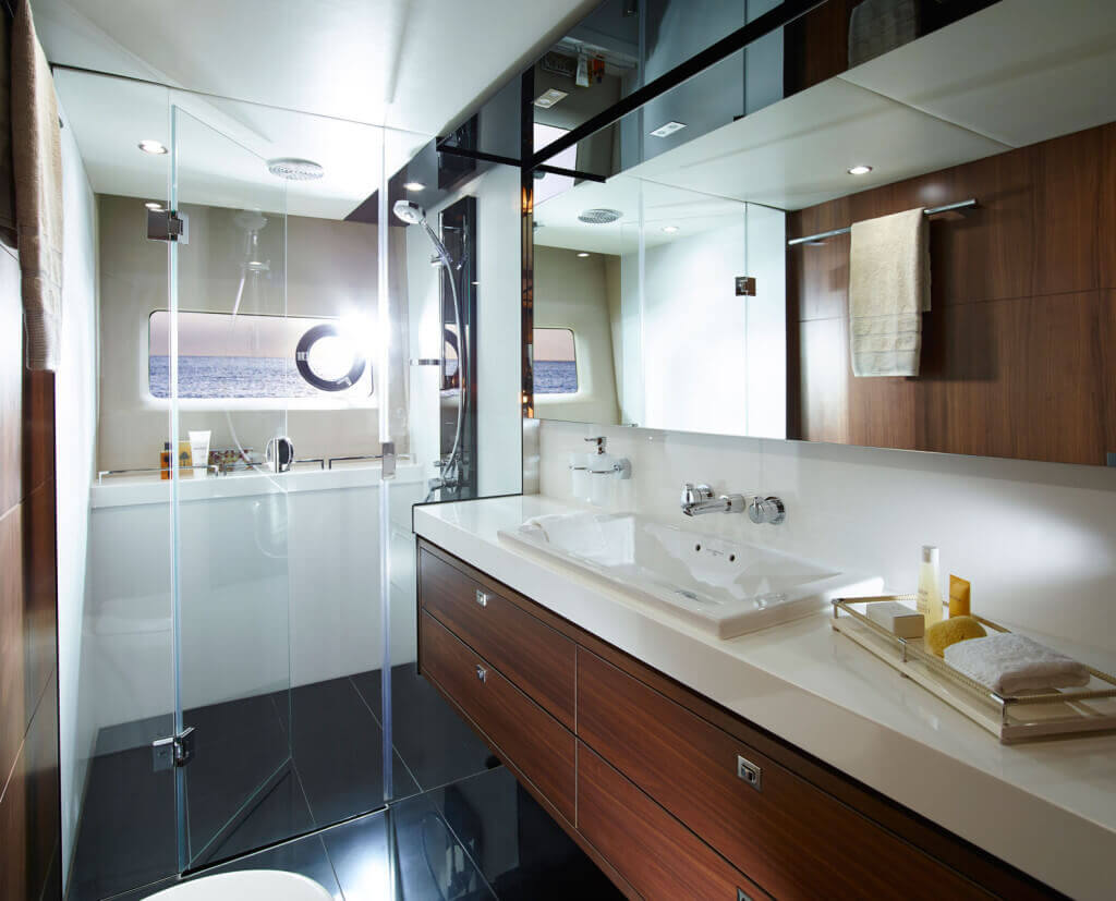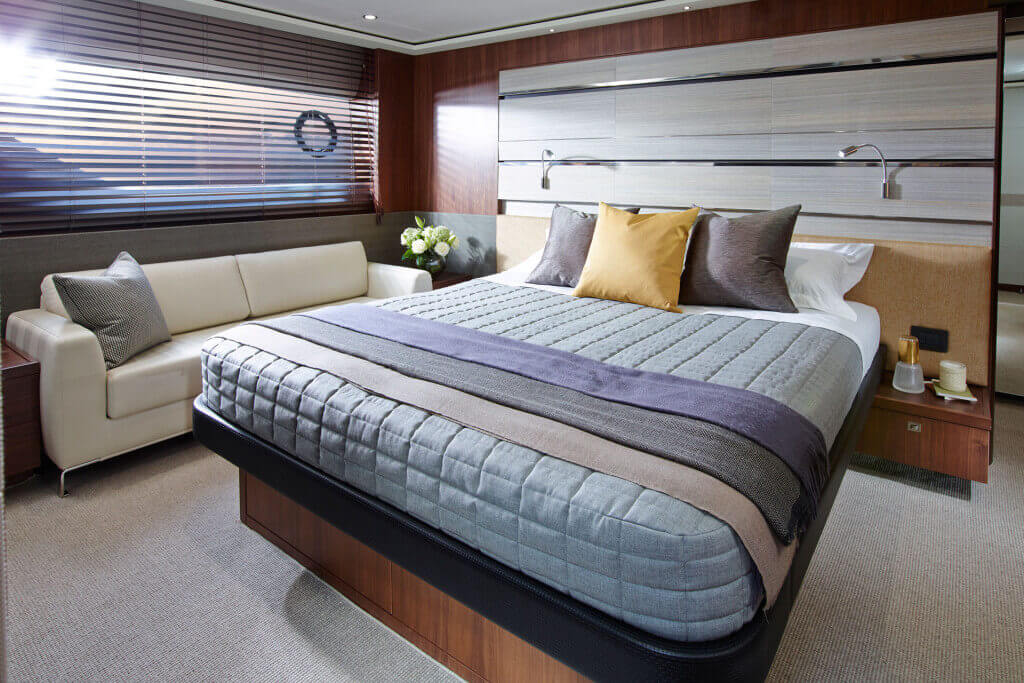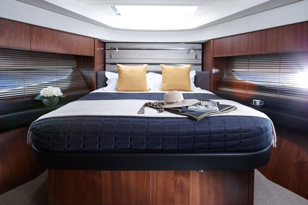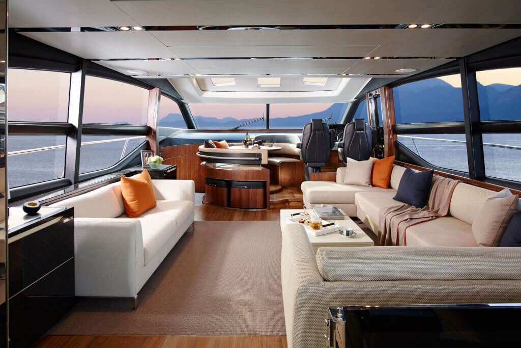 In the cockpit, the Princess design team have created a 3.9m tender garage, able to take a jet RIB plus a whole range of toys. Above the garage lies a vast sunpad area, and there is still plenty of room for a deep and wide surround of cockpit seating and a full wet bar. For maximum on water lifestyle, the deck saloon is designed to flow into the cockpit, creating a vast one-level living area. Below decks, a three-cabin layout includes a full beam master stateroom enjoying those S CLASS angled hull windows and a new take on interior design and finish.