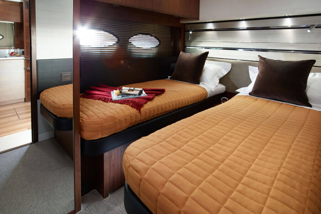 • Two single berths with drawers below with optional powered sliding conversion to double
