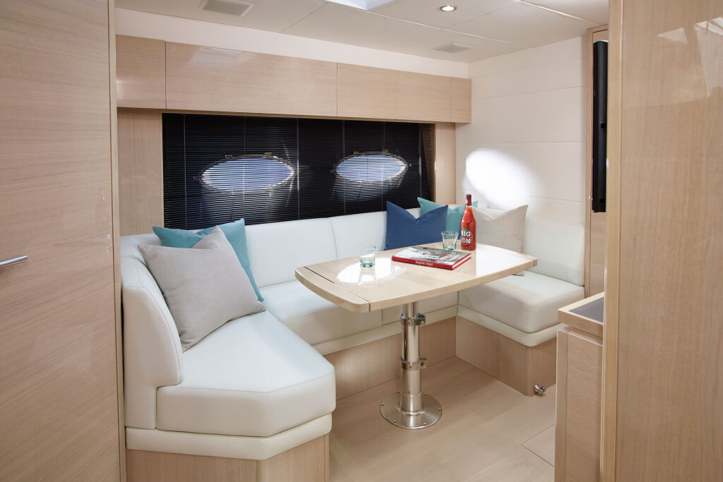 The dinette seating is arranged around a teak-topped table and the wet-bar with a built-in griddle, sink and fridge all make for a great entertaining space.
