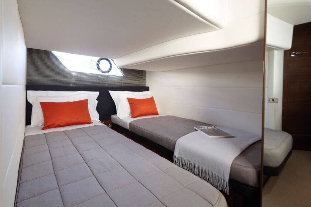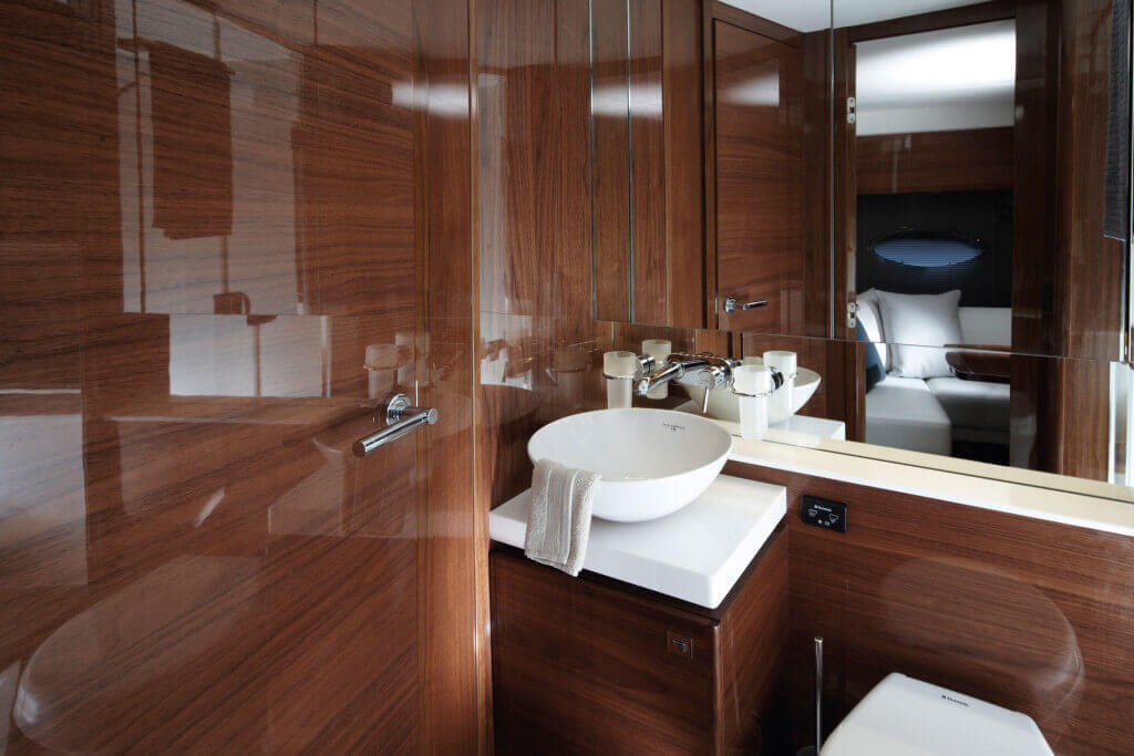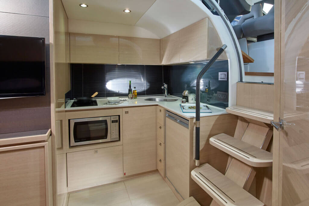 Down below the master cabin offers both headroom and space and lots of light and the mid cabin has sliding berths which means, within seconds, you can make it into a double. The galley is compact yet cleverly designed and the heads befit those found in a boat from a class above!