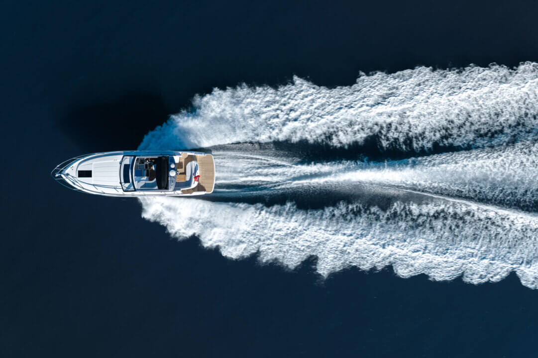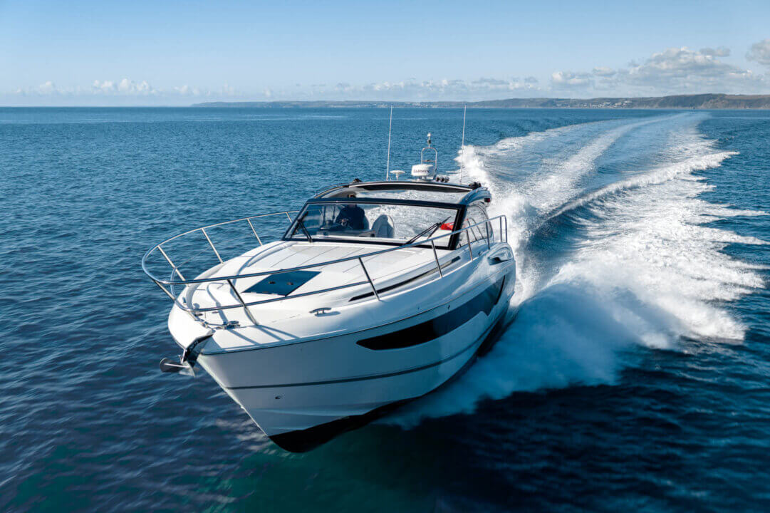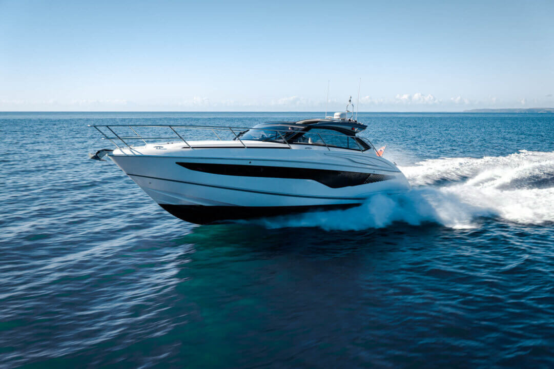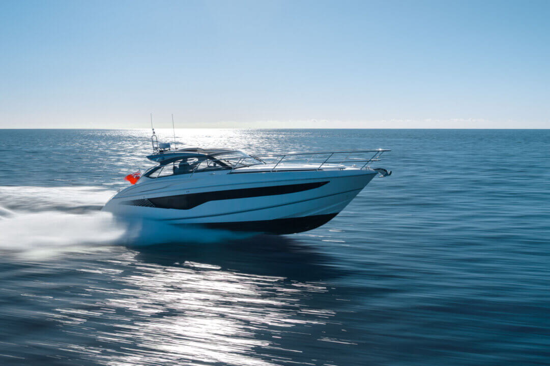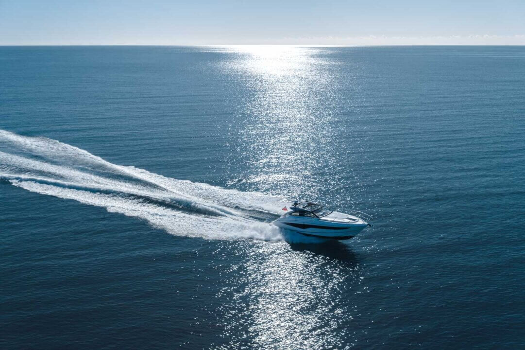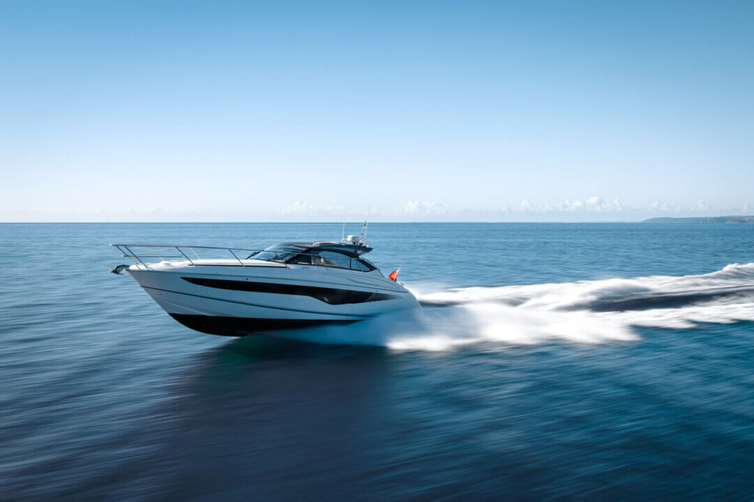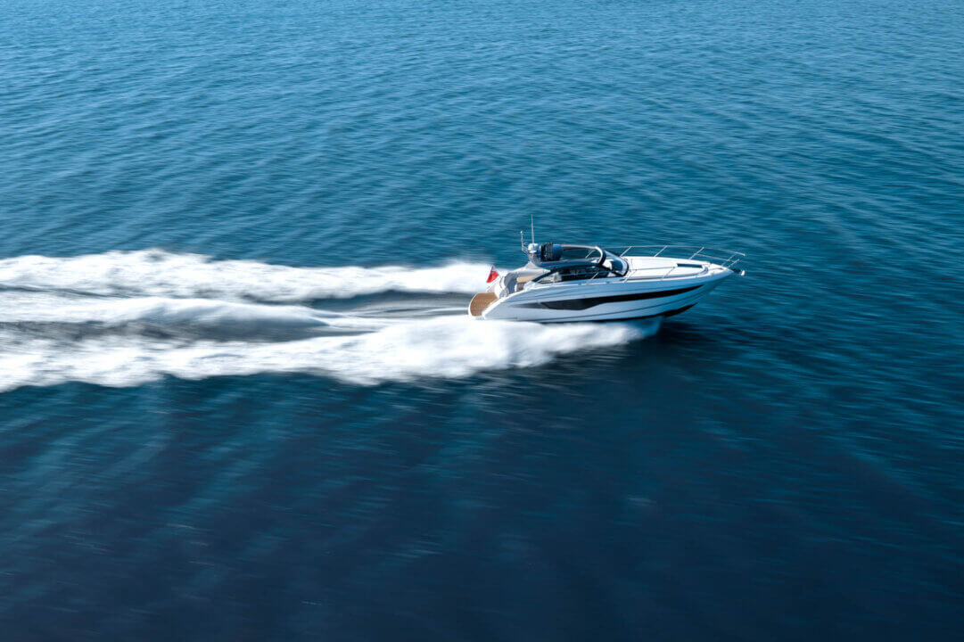 The new V40 quintessentially showcases the dynamic exterior, exceptional seakeeping and voluminous space of our V Class. Her port light windows cascade across the length of her deep-V hull, flooding the saloon and cabins with light. When entertaining, her spacious cockpit enjoys a beautiful teak table and well-equipped wetbar in a striking oyster grey with an option to specify a convertible sunbed aft.