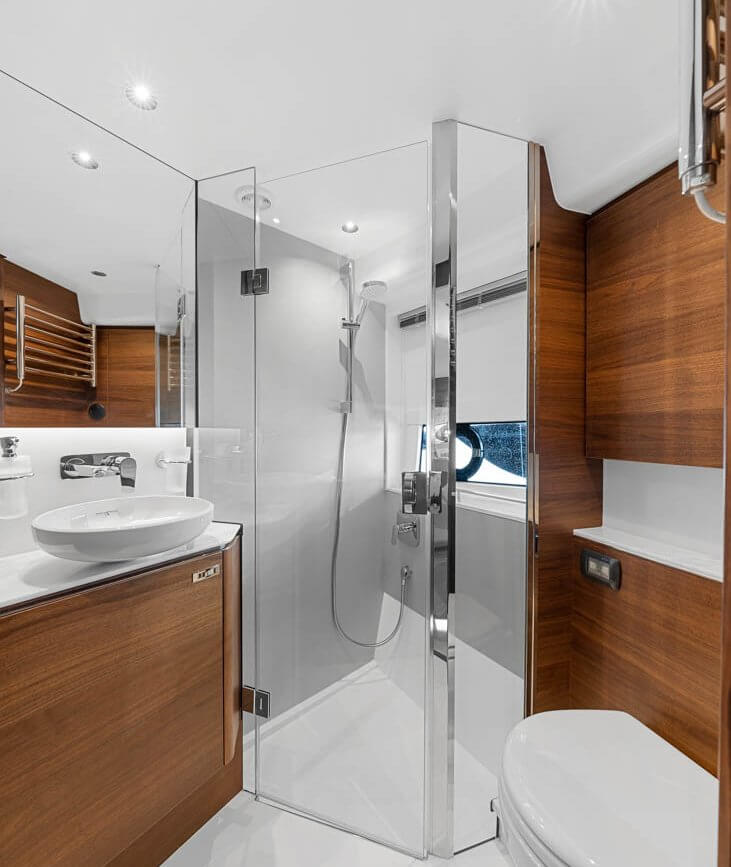 • Electric quiet flush freshwater WC system with holding tank, content gauge and low noise manual overboard discharge, as well as dockside discharge.