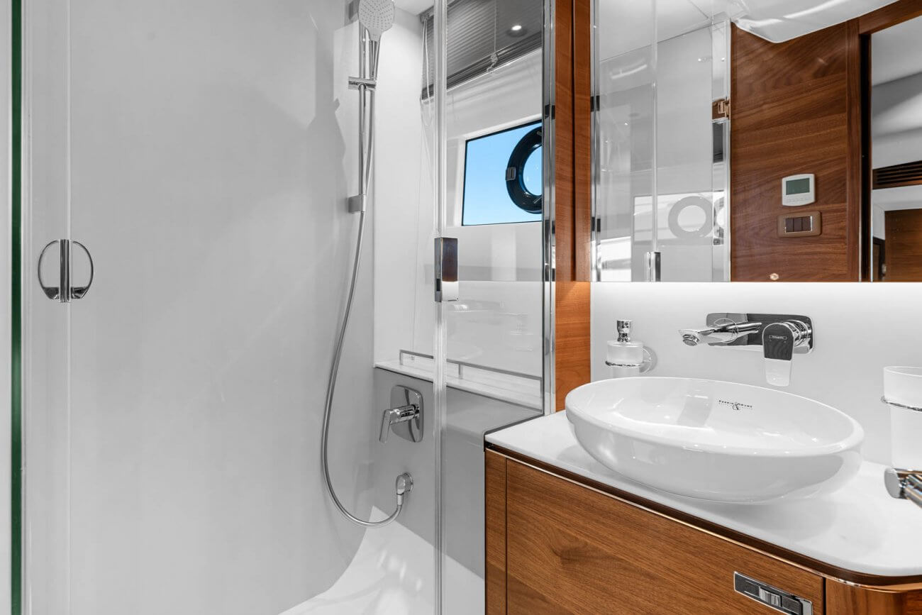When entertaining, the extended cockpit provides exceptional outdoor living space in which to create unforgettable experiences. The elongated canopy provides a shaded area to escape the heat of the sun whilst being in a position to fully appreciate the yacht’s balanced performance. Below deck, a bright, modern open galley sits opposite a sociable entertaining space. Four guests can enjoy two beautifully appointed cabins that are filled with natural light from the extensive hull glazing, with a full-beam master stateroom situated amidships.