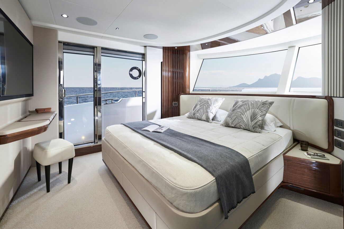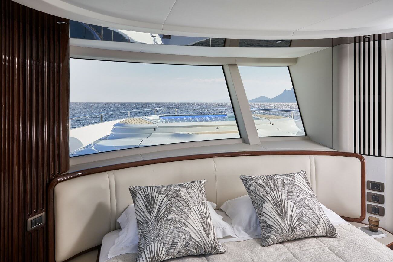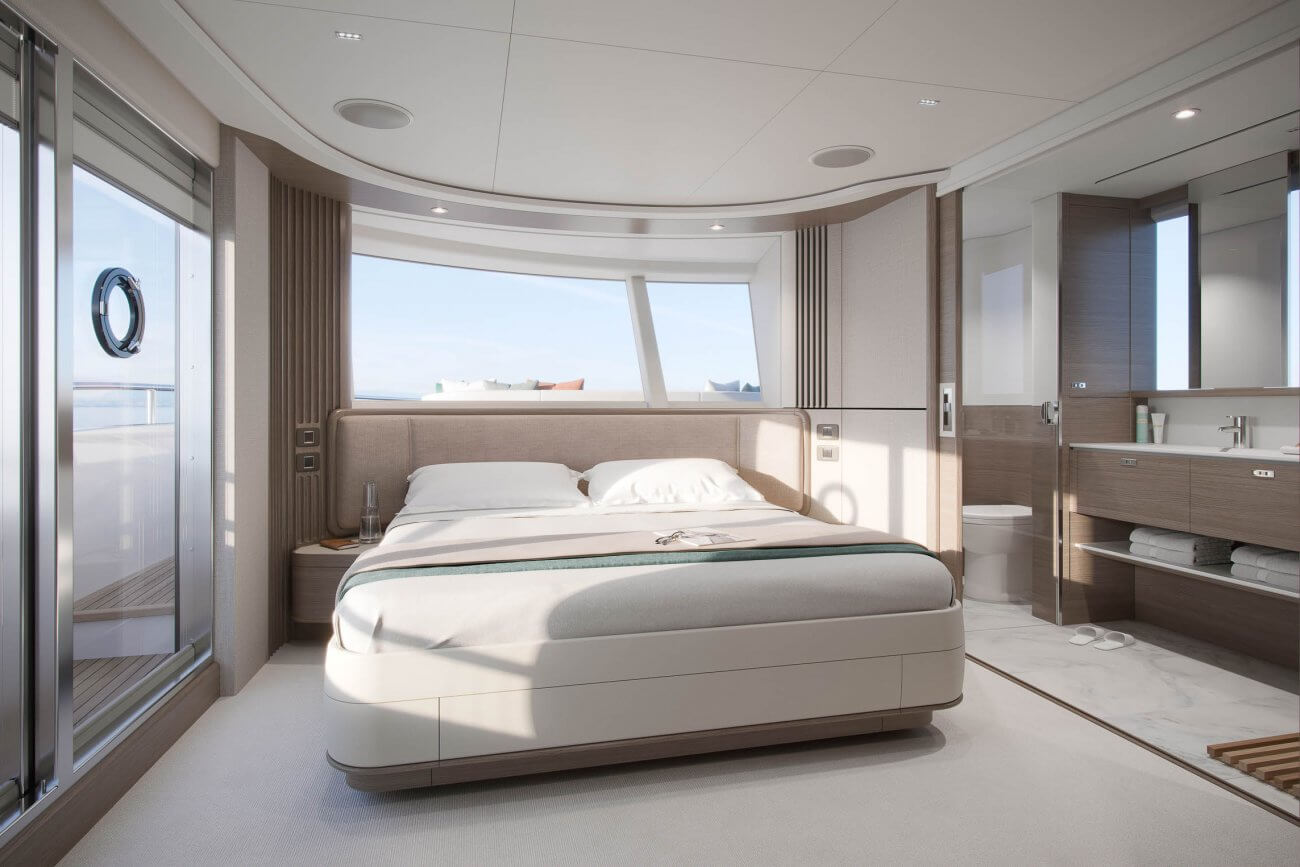 The stature of the X80 profile is defined through the increased height of the bulwarks, topsides and enclosed wheelhouse. Her ‘S’ shaped canopy flows into the flybridge deck to balance the visual weight and disguise the volume of the expansive sky lounge. The X80 brings the outside in through the maximisation of glazing which flows along the entire length of the main deck encasing the saloon, galley and forward dining area. The use of light and innovative design continues below decks where 8 guests are accommodated across 4 cabins, a full beam master stateroom located amidships, a forward guest stateroom, a double guest to starboard and a twin cabin to port. Located aft of the main accommodation is the crew quarters which can accommodate 3 crew with the standard layout. Life on-board the X80 really is unlike that of any other boat of its size.